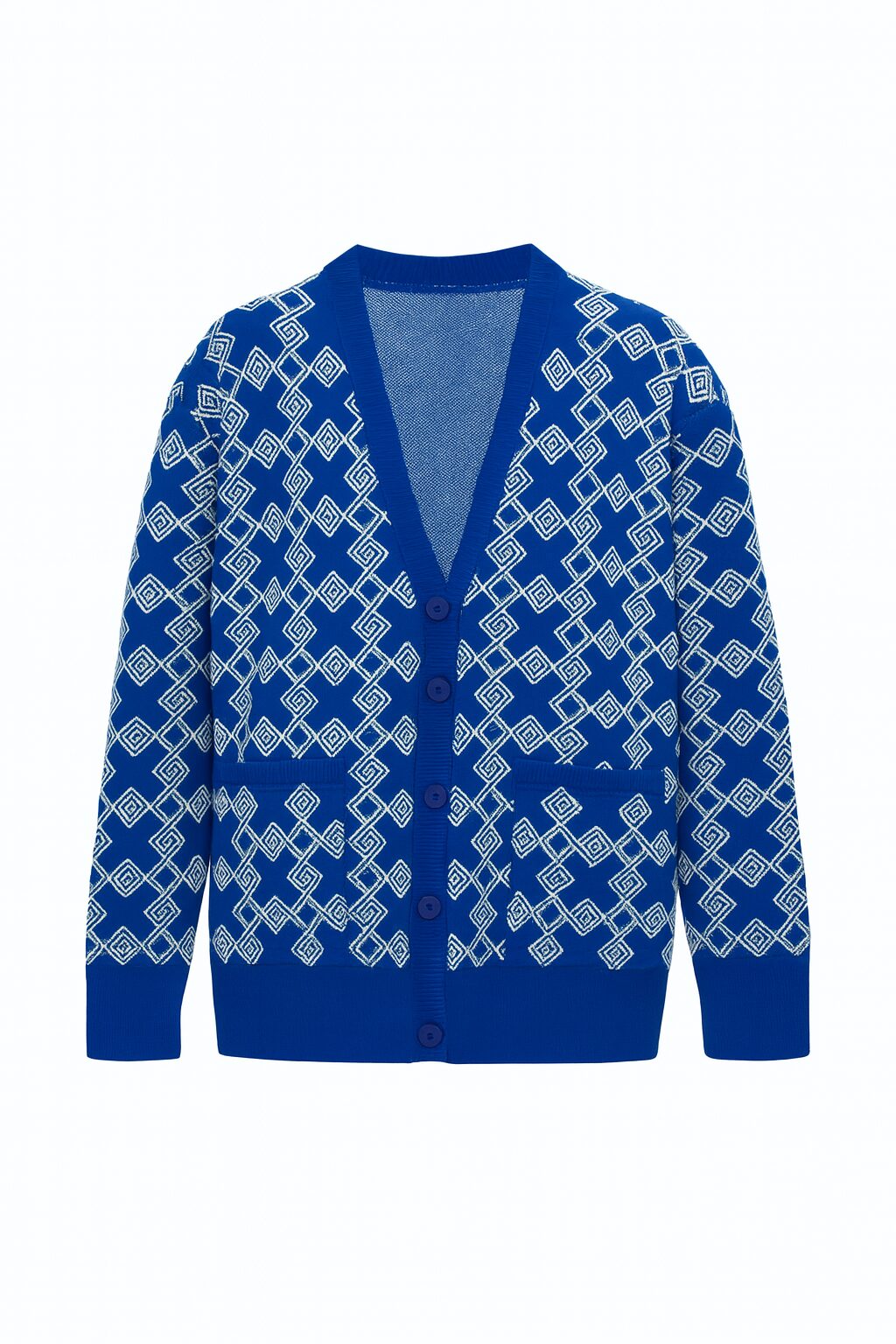 Cardigan en maille à manches longues de couleur bleu électrique, orné d’un motif géométrique répétitif blanc (style clé grecque/carrés imbriqués). Il présente une encolure en V et une fermeture boutonnée sur le devant.