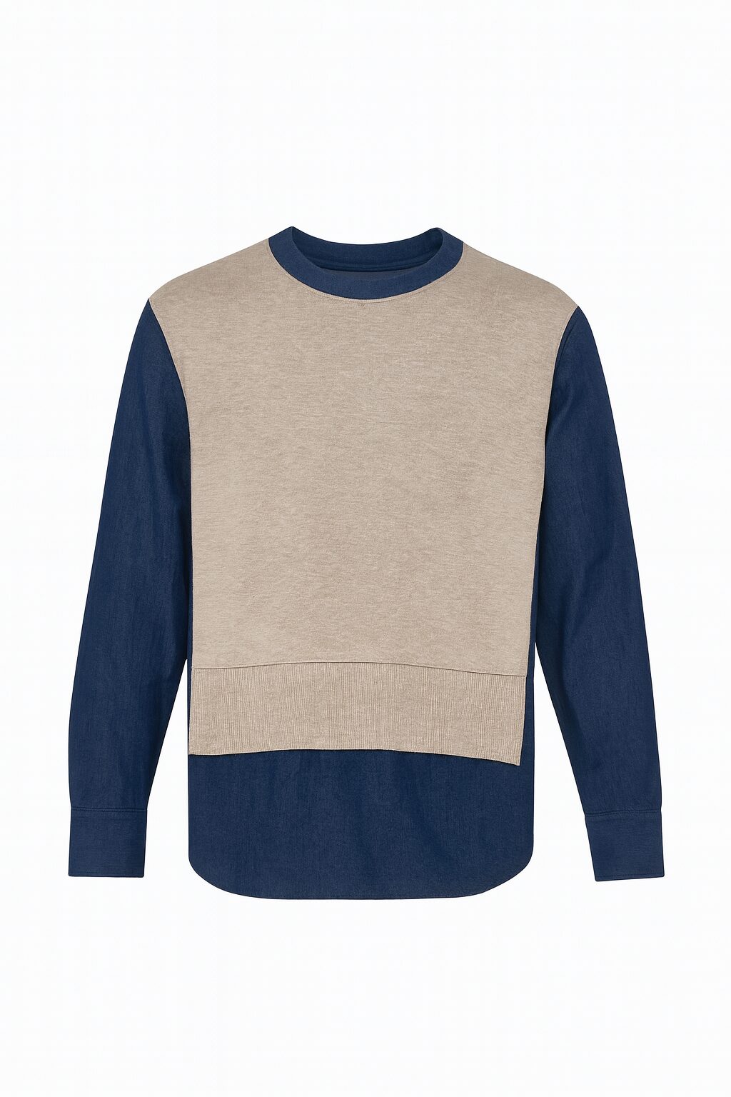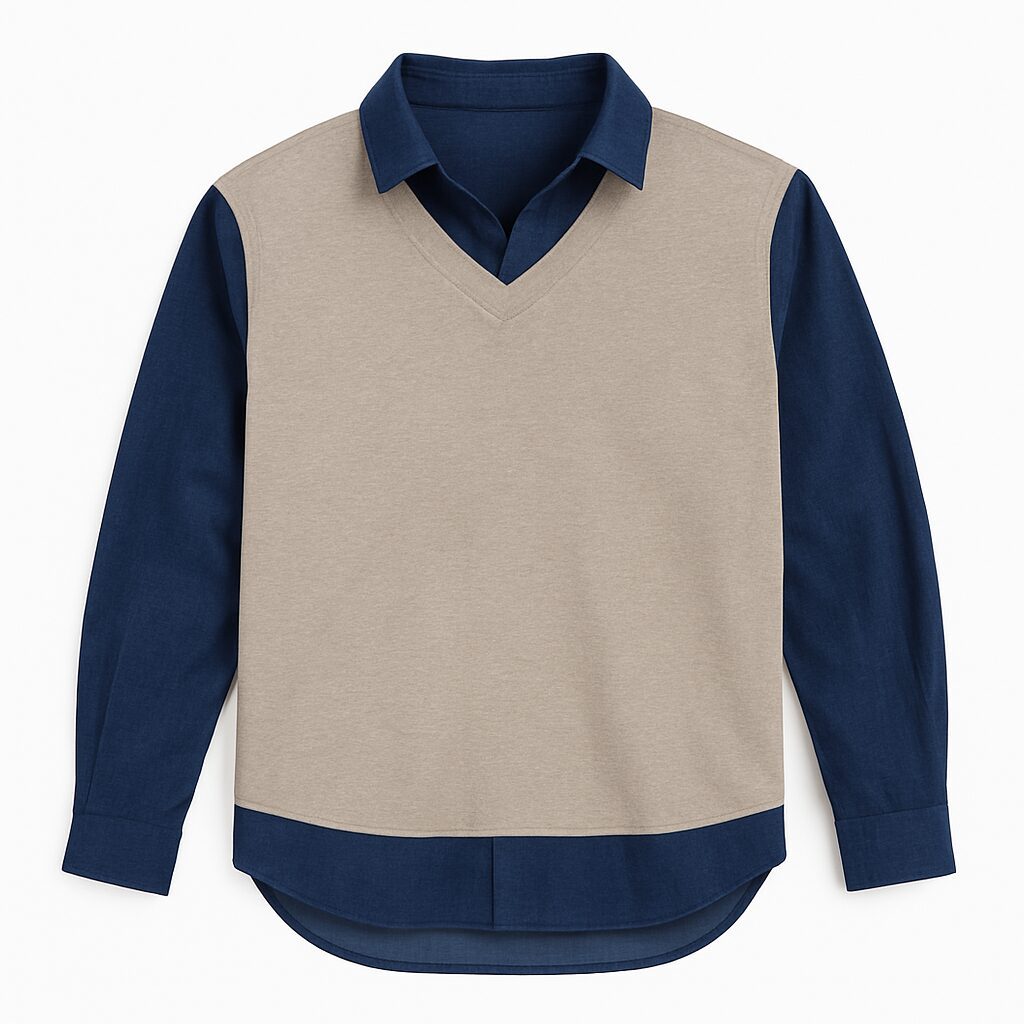 Chemisier à manches longues style 2-en-1. Base en denim bleu foncé et fausse superposition d’un gilet court en maille fine beige clair à col en V.