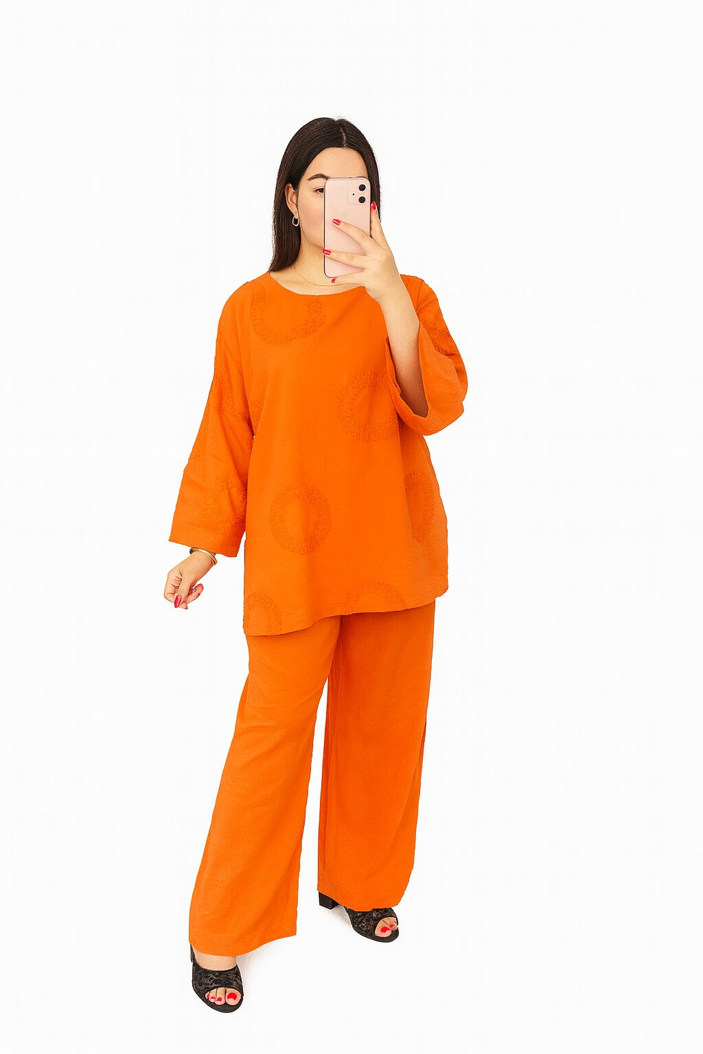 Un ensemble deux-pièces (co-ord) de couleur orange vif composé d’une tunique ample à manches bouffantes avec des motifs brodés ton sur ton, et d’un pantalon large (type palazzo) assorti. L’ensemble est à la fois décontracté et chic, privilégiant une silhouette fluide et confortable.