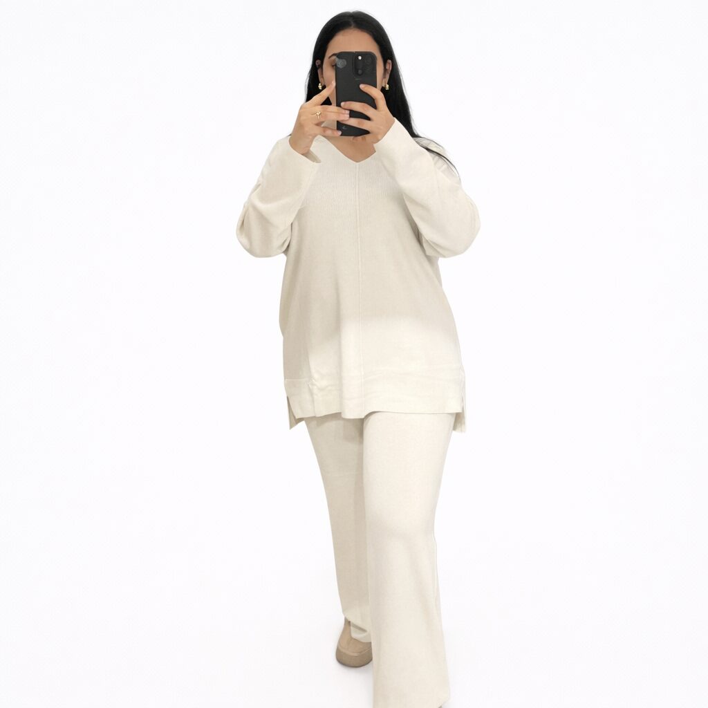 • Le Haut : Un pull à col en V de couleur crème (off-white). Il présente une coupe droite et fluide avec une couture centrale apparente qui structure la silhouette.