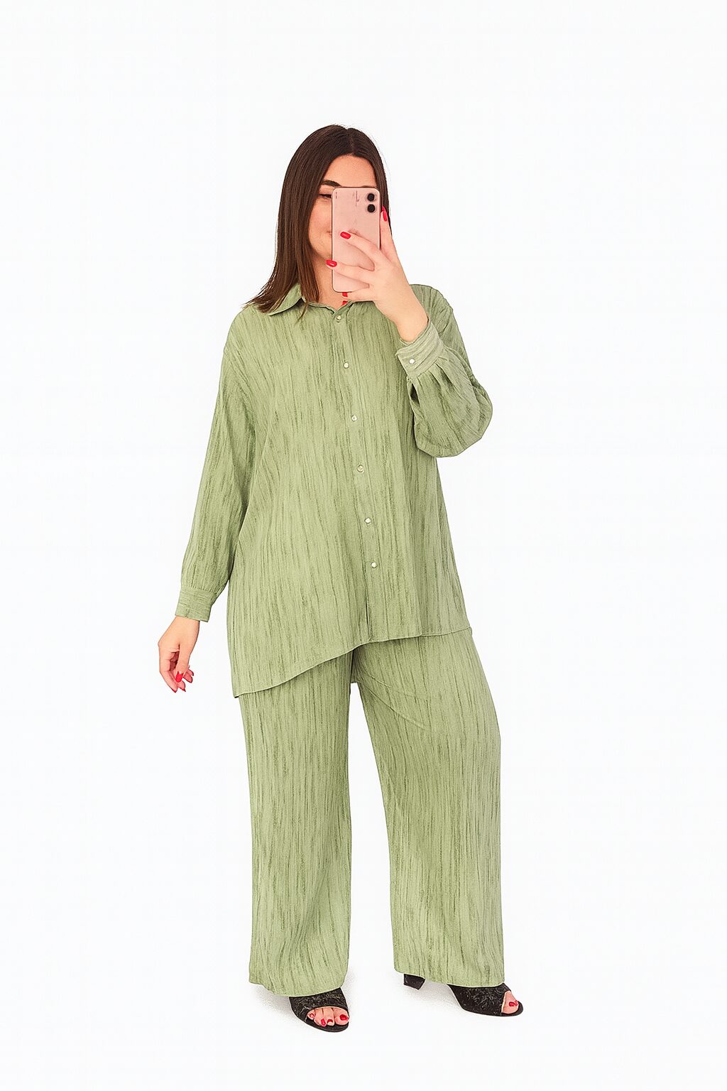 L’ensemble est un coordonné deux-pièces de couleur vert sauge clair (light sage green) ou vert menthe pâle, fabriqué dans un tissu à effet plissé ou froissé vertical (crinkle texture).