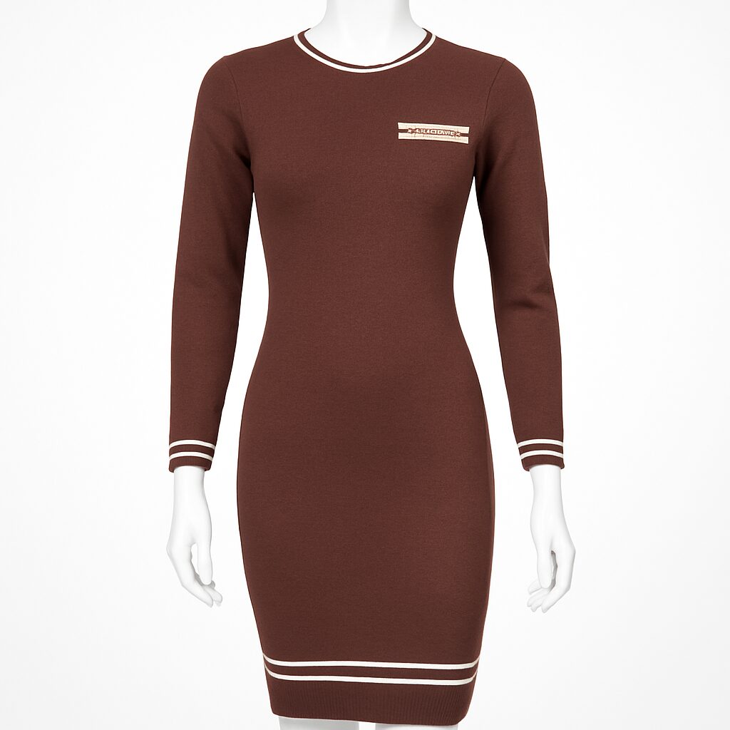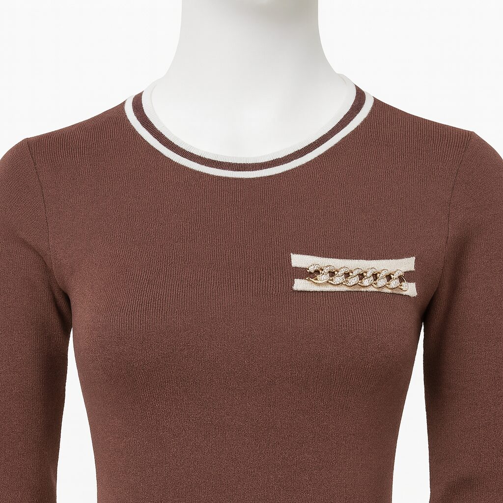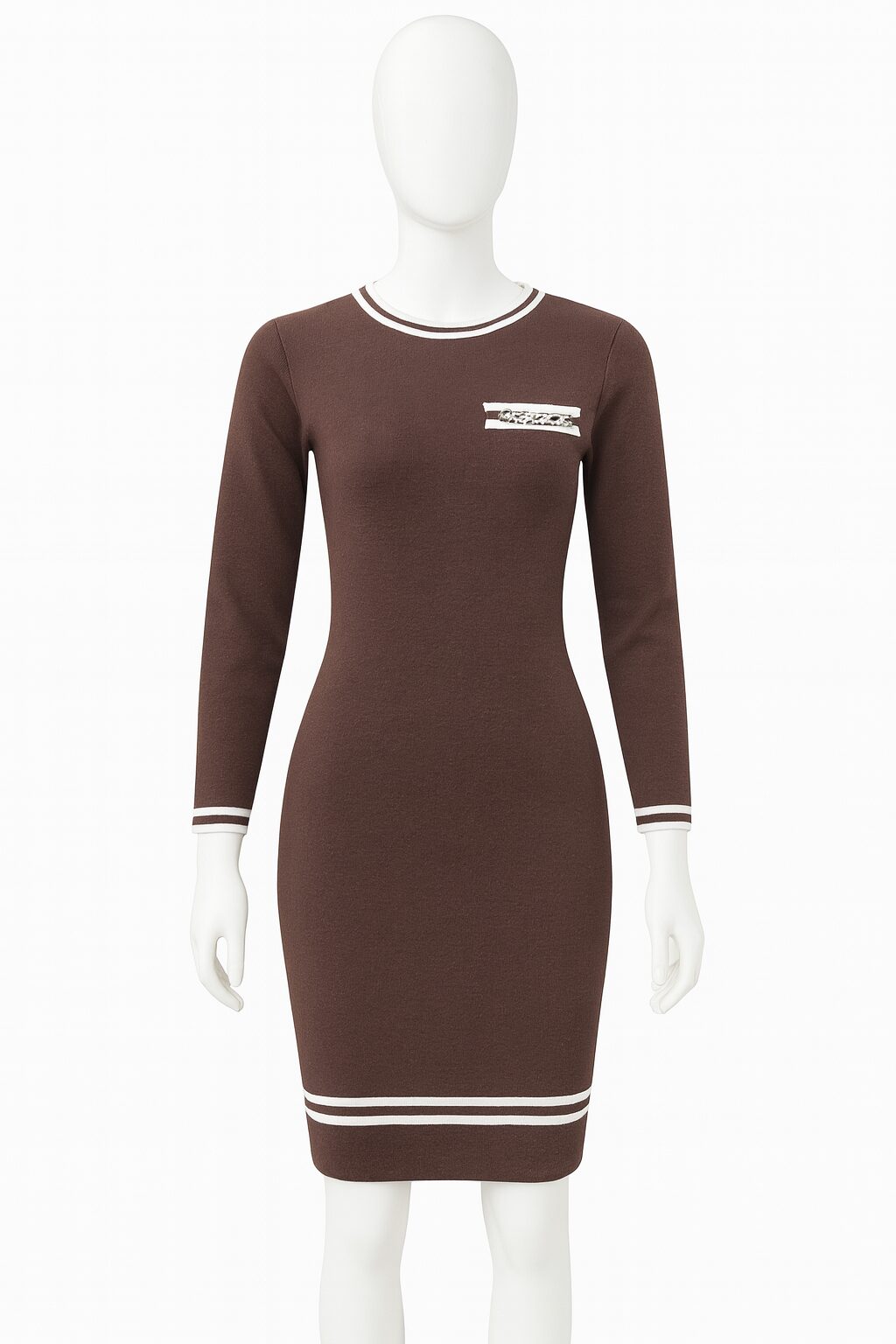robe pull ajustée en maille ,couleur :marron uni foncé ,style et coupe :coupe ajustée et moulante arrivant au niveau ou juste au dessus du genou, bandes contrastées: la robe est accentuée par des doubles bandes fines de couleur blanche qui contrastent fortement avec le tissu marron, ornementation :cet empiècement est décoré d’une chaine métallique dorée épaisse disposée en boucle ,ajoutant une touche d’élégance et de luxe.