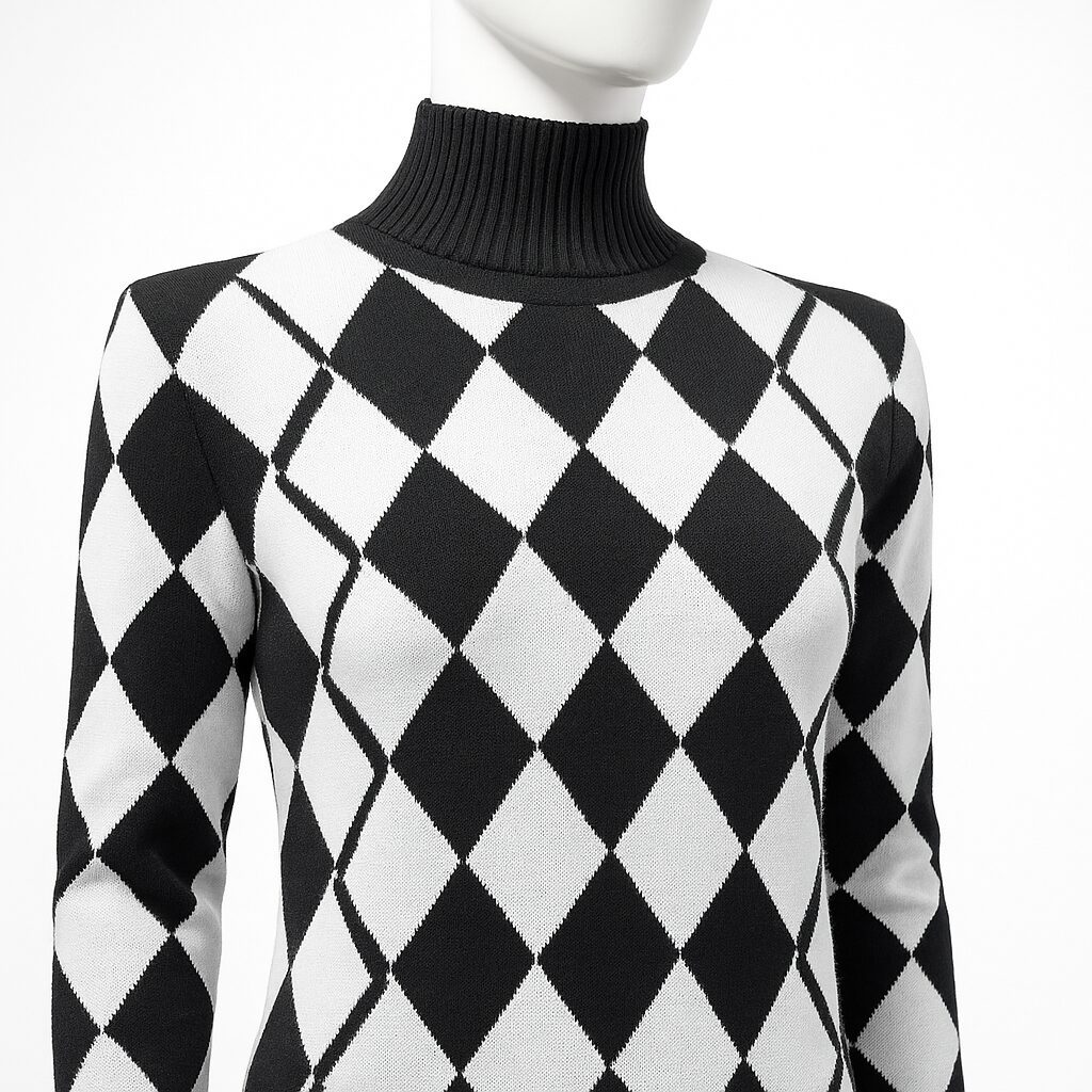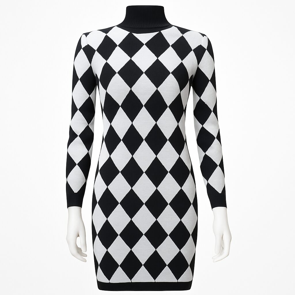 Robe pull ou robe en maille ,couleur motif bicolore en noir et blanc , coupe droite et décontractée ,style mini -robe ,offrant une silhouette confortable et un look rétro.