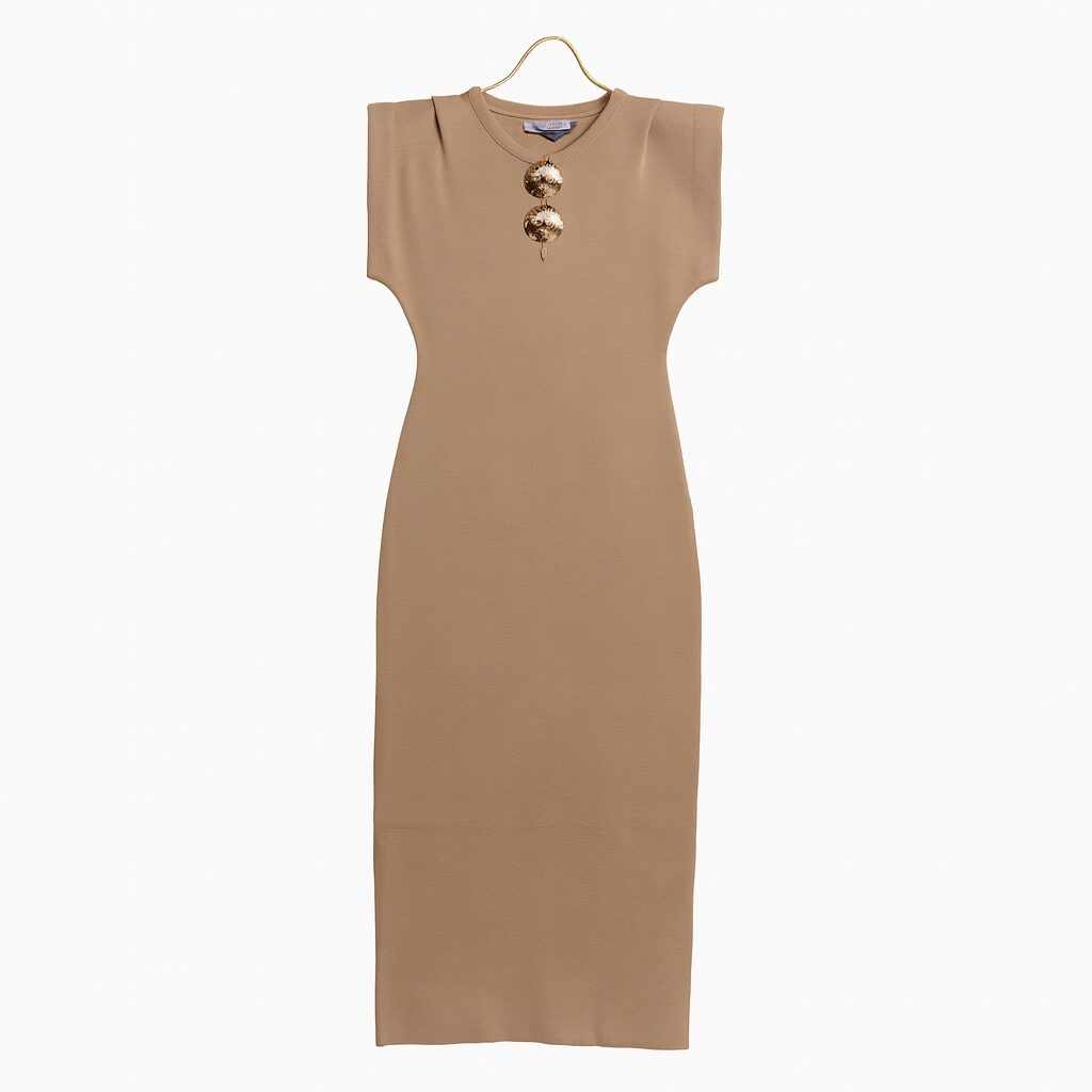 Une robe longue et ajustée en maille beige/taupe avec des manches courtes structurées. Elle est ornée de deux grands boutons décoratifs dorés sur la poitrine, lui donnant un style à la fois chic et sobre.