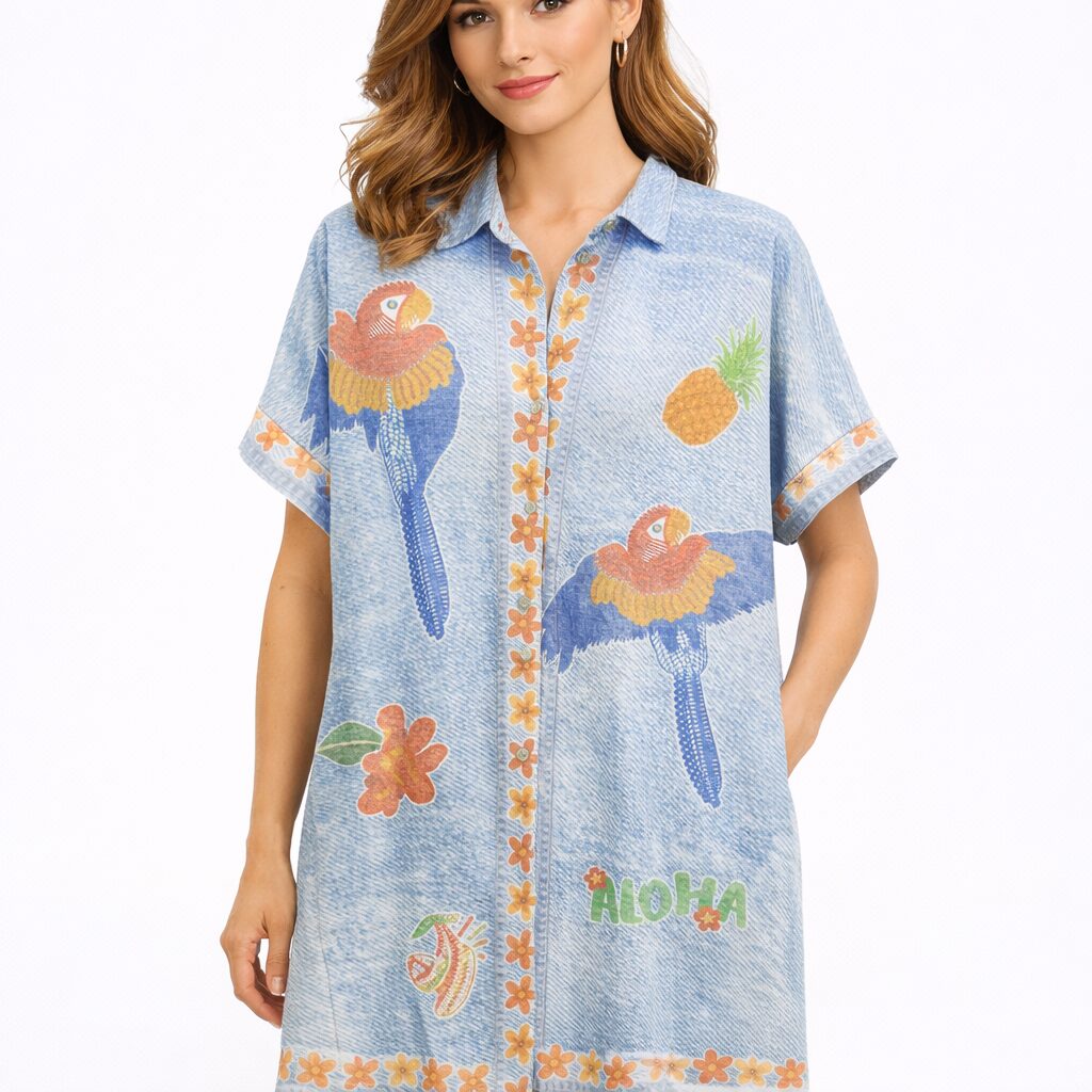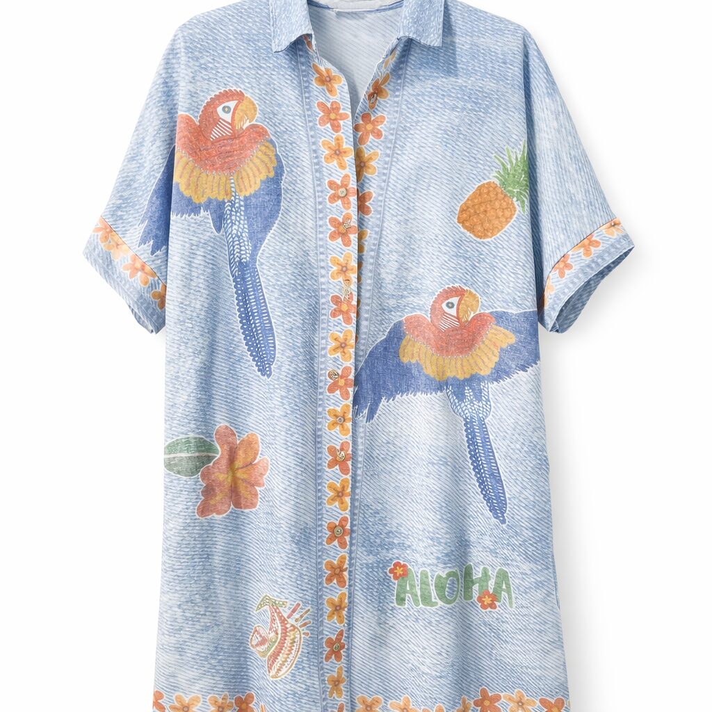 • Les Motifs : Un imprimé riche et coloré sur un fond bleu clair effet denim, comprenant des perroquets exotiques, des ananas, des fleurs et l’inscription « ALOHA ».