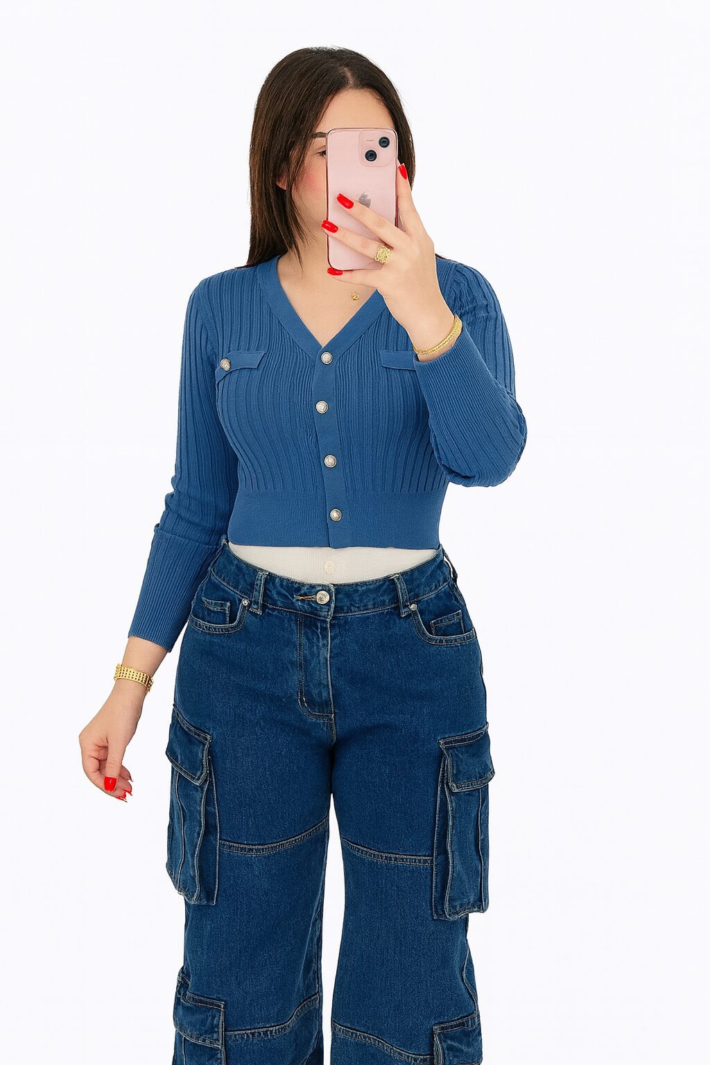 Tricot bleu Maille fine et côtelée, Deux fausses poches décoratives (ou très petites) sur la poitrine, chacune accentuée par un petit bouton doré assorti.